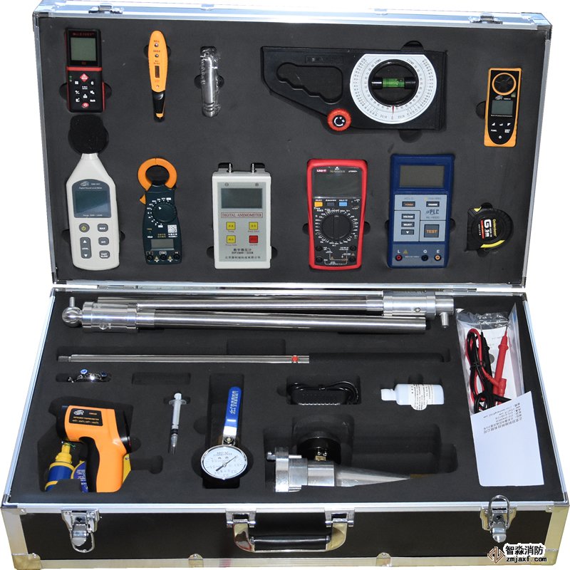 配置:感烟探测器试验装置;感温探测器试验装置;水喷淋系统试水检测装置;消火栓系统试水检测装置;数字兆欧表;数字噪音计;数字微压计;数字测距仪;红外测温仪;垂直度测定仪;多功能工程坡度测定仪;四合一测量仪(温度、湿度、风速、照度);钳形电流表;数字万用表;数字秒表;附件:数字试电笔、钢卷尺、打火机加热笔附件盒、发烟棒盒、烟嘴、充电器、丁烷气瓶、仪表测试笔、、多功能刀。