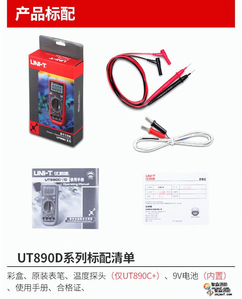 | 标准配件 | 表笔、电池、温度探头 (仅UT890C+) | ||