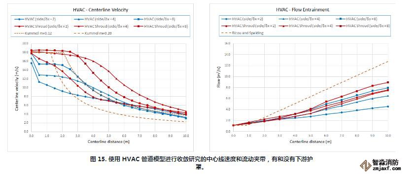 添加护罩的原因是为了确保出口流在轴向上。FDS 计算单元边中心处的单元速度(交错网格)。HVAC 管道在通风口处连接到网格,并且在接触通风口的单元表面上指定了通风口处的流动边界条件。结果,流动可以在通风口下游的第一个单元中膨胀,从而降低轴向速度。这可以在第 2 章的收敛性研究中看到。护罩沿轴向保持出口流动,确保在风扇出口处保持一维轴向速度。