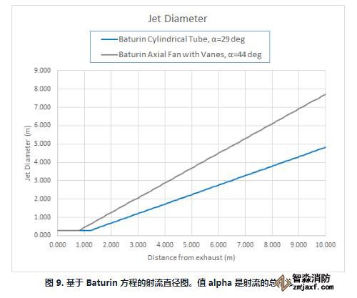 Baturin 还提供了有关不同射流的展开角的数据。对于圆柱管α=29 deg和带导向叶片的轴流风机α= 44 deg. 计算出的射流直径如图 9所示。